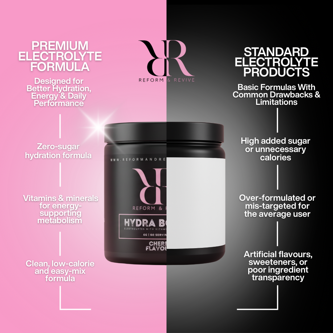 Stay refreshed and replenished with Reform & Revive Hydra Boost — a zero-sugar hydration formula designed to support energy and balance throughout your day.